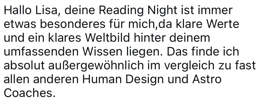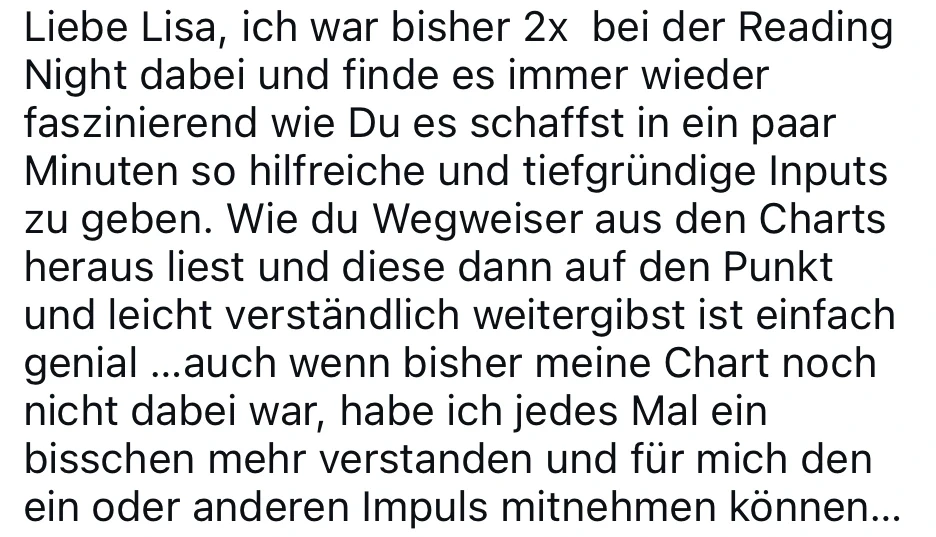 In der Reading Night nehme ich dich einen Abend lang mit in meine Arbeit, meine Impulse und meine Energie. Du siehst das Codes of Life® Tool in Aktion und bekommst neben den echten Geschichten der Teilnehmer auch meine Gedanken und mein Wissen zu unterschiedlichsten Aspekten der Charts.